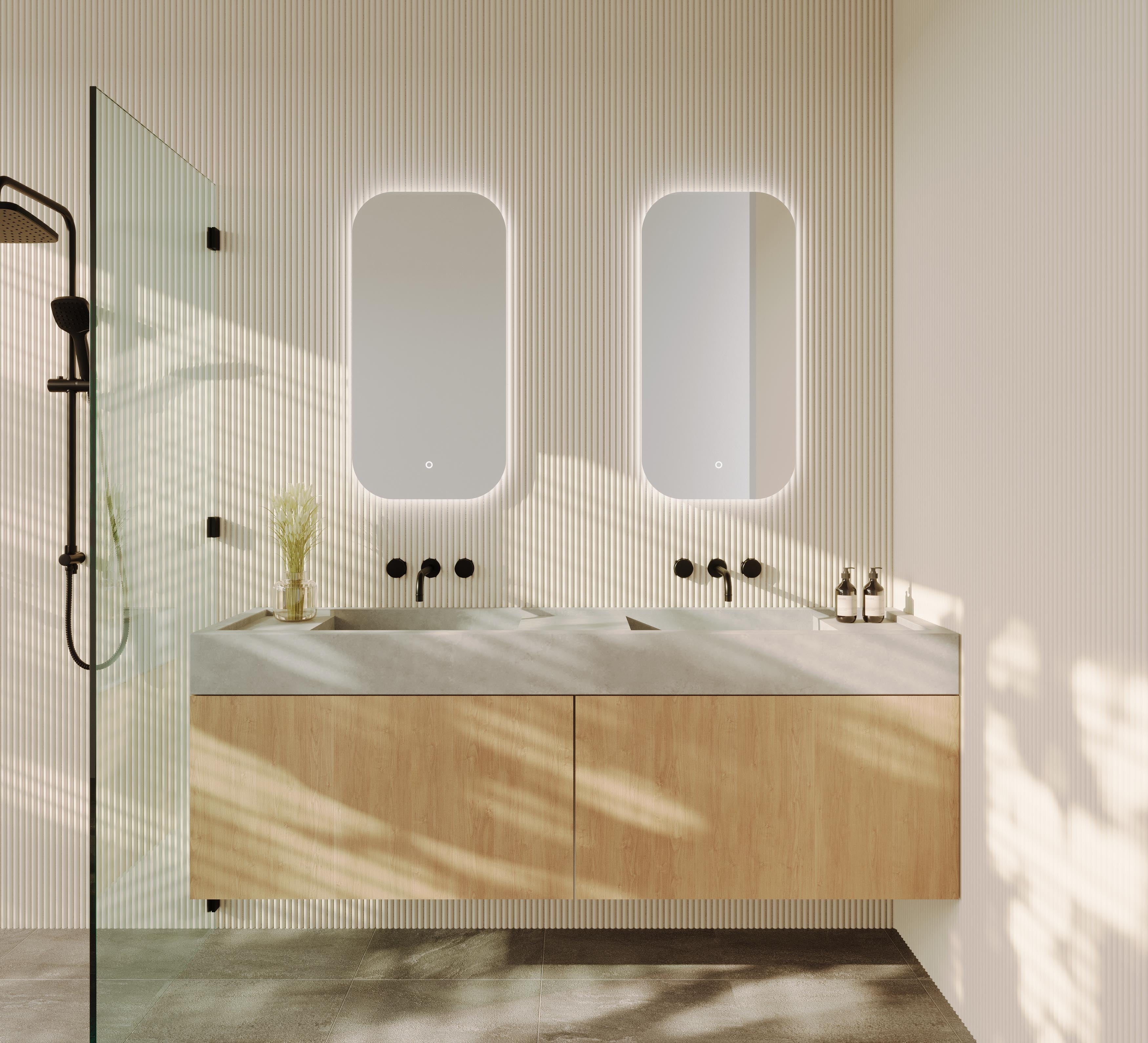 We purchased two mirrors to go above our double vanity. They look fantastic and I love the option to change the light colour from cool to warm white. The lights also dim if you place your hand in front of the sensor.This is a bit of a design flaw as the lights dim every time you lean over the basin. I wish this was a function you could turn off as it’s really annoying.